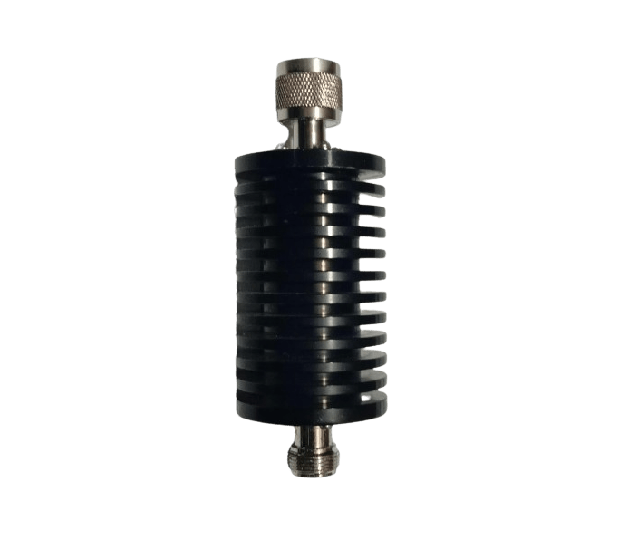 A 20 dB 50 W N-Type attenuator for reducing signal strength by 20 dB. It operates up to 3 GHz and handles up to 50 watts of power.