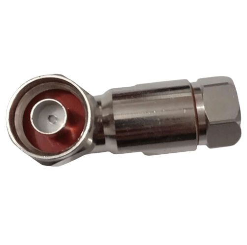 This right angle N-Type male coaxial connector is engineered for use with 1/2-inch SF (Super Flexible) coaxial cable. The right angle form factor is a key feature, making it perfect for applications with limited space or for a cleaner, more organized cable routing path. The connector uses a clamp-style termination, which provides a quick and secure mechanical and electrical bond to the cable without the need for soldering. This combination of space efficiency and reliable performance makes it an excellent choice for a variety of telecommunications and industrial systems, especially in densely packed equipment racks and enclosures.