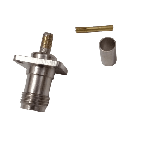 This TNC female 4-hole panel-mount connector is designed for secure, fixed installation on a chassis or enclosure using its standard 4-hole flange. The connector’s body is engineered to provide a permanent termination for LMR200 coaxial cable using a crimp-style attachment. This method is known for creating a strong, durable, and reliable electrical and mechanical bond that can withstand vibrations and physical stress. The secure mounting and robust construction make it an ideal choice for a wide range of professional applications, including telecommunications, test equipment, and industrial control systems.